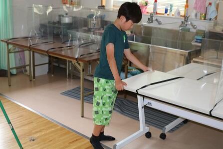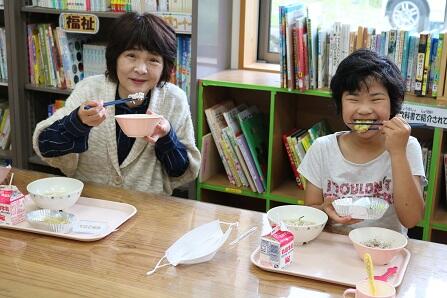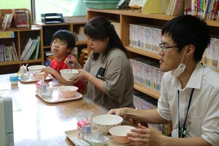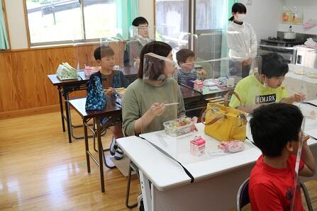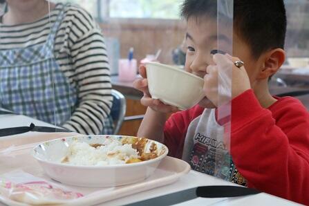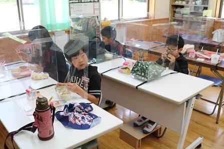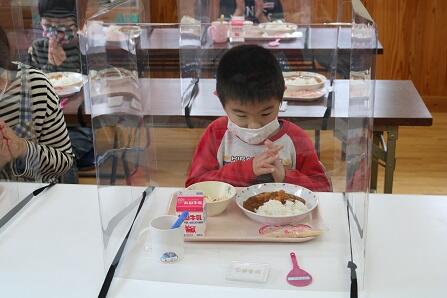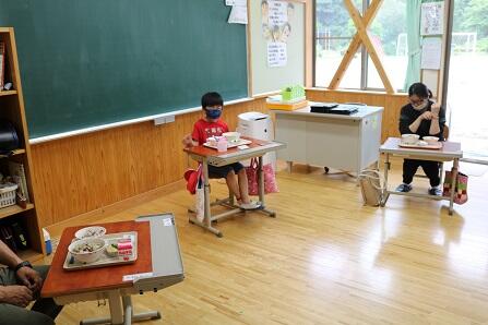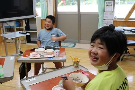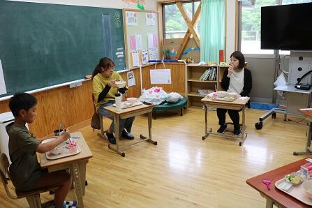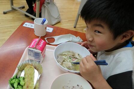 昨日入学して、今日は小学校初めての授業・初めての給食でした。複式学級なので、2年生と一緒の授業です。給食は、ポークカレーとスパゲッティーサラダ、お祝いクレープでした。おいしそうに食べていますね。