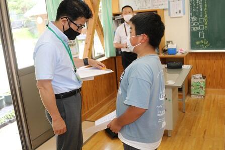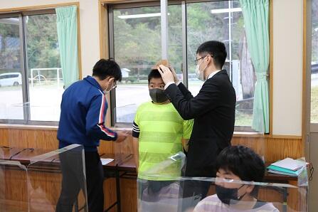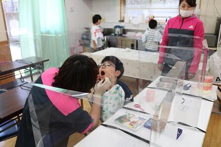 1校時が終わって、不土野小の全児童9人は、村のマイクロバスに乗って、片道約40分の道のりを移動します。検査は、早く到着した学校から順に行っているようです。