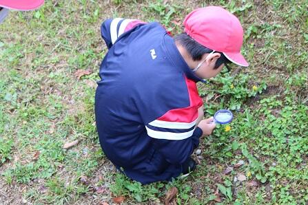 1・2年生が虫眼鏡を持って元気に外へ飛び出していったので、何だろうと思って追いかけると、何かを楽しそうに観察していました。「何してるの。」と聞くと、「タンポポ探してます。」と答えてくれました。どうやら2年生の国語の学習で、「たんぽぽのちえ」という教材文があるようです。タンポポの綿毛を探しているようですが・・・・この前まではたくさんあったのに・・・草刈りで全滅してました(>_<) 花びらは少し残っててよかったです。