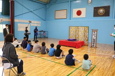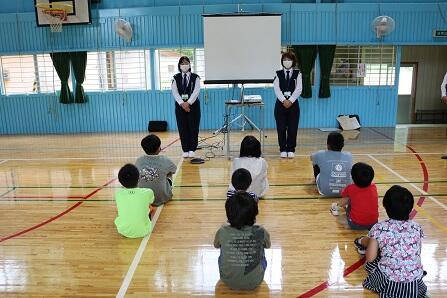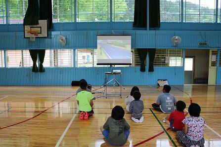 椎葉村派出所の方2名、日向市交通安全協会の方2名に来校していただき、5時間目に全校一斉の交通安全教室を行いました。予定では、運動場で実施だったのですが、雨のため体育館で実施しました。