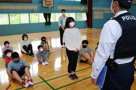 5時間目に椎葉村駐在所のお二人に来校していただき、不審者対応避難訓練を行いました。警察の方に不審者役をしていただき、児童を避難させる、助けを求める、取り押さえる、通報するという役割を分担して行いました。こういったことはなかなか起きない、起きてほしくないことではありますが、備えることはとても大切です。警察の方を取り押さえるときに、不思議と本当の不審者に思えてきました。