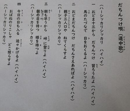 今日は伝承活動がありました。前回は、「ひえつき節」をご指導していただき、今回は、「だちんつけ唄」をご指導していただきました。「だちんつけ唄」とは、「ひえつき節」と同じく、椎葉村の民謡の一つです。