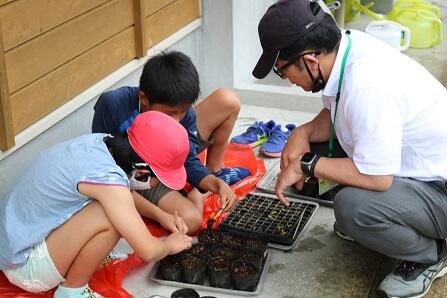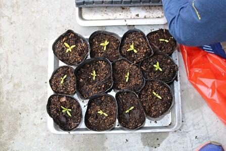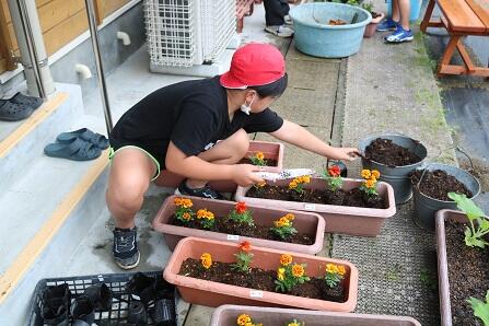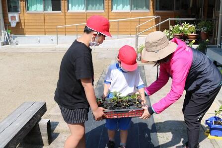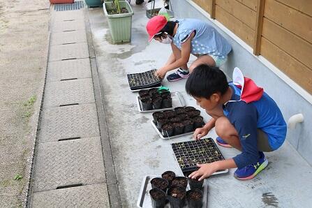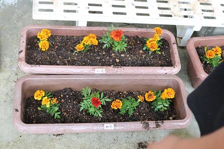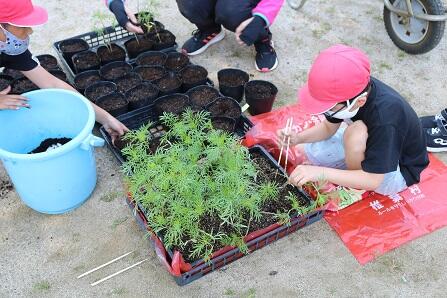 3時間目に全校で栽培活動を行いました。今年は、ひまわり、コスモス、マリーゴールド、日々草、ジニア、ベルサイユミックス、ファイヤーボール、サンダーミックス、サンタスッチックイエロー等を育てます。子ども達は、種の植え方の説明を聞き、ポットに一粒一粒丁寧に種を植えていました。植えた後もみんなで協力しながら運んだり、水やりをしたりしました。これからしっかり成長するように全校で見守り、お世話をしていきます。きれいな花が咲くのが楽しみです。