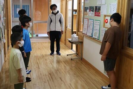 まず、玄関に整列すると、「お願いしま~す。」の大きな声で先生達も玄関に集まります。先生達が集まると、「おはようございます。」を1人1人が言い、その後全員で声を揃えて言います。