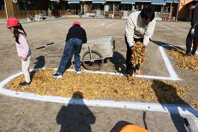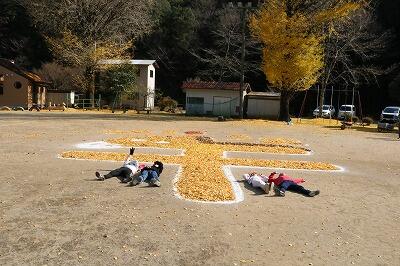 3年生と5年生が協力して下絵を描き、構想に2週間を費やしました。製作当日には、児童・職員全員でイチョウの葉っぱを敷き詰めて、約1時間で大作を完成させました。