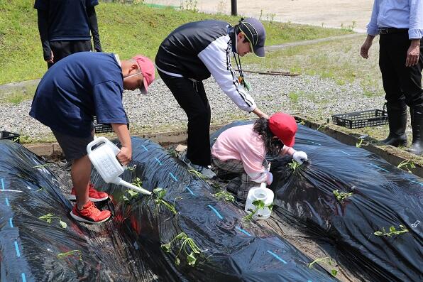 2年生が育てているミニトマト、オクラ、枝豆です。