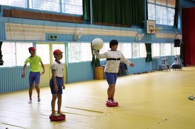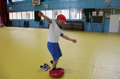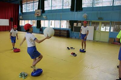 バランスクッションという教具のようです。立っているだけでも不安定なのに、そこで体をひねってボールを投げています。