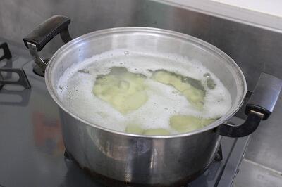 15分ほどゆでたじゃがいもを熱いうちにつぶします!そして、そこにツナ!塩!こしょう!を入れたらこねます!そして小判型に形を整えます!