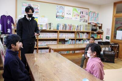 児童3人が分担しながら歓迎のあいさつをします。不土野小のよさ、特徴を一生懸命伝えようとしている姿が印象的です。