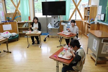 まず、「給食参観」で、おうちの人と給食を食べました。