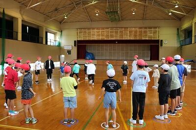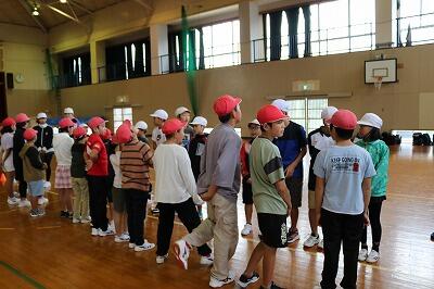 通潤橋に行く前に、馬見原体育館で交流活動を行いました。今年は、尾向小の児童の皆さんが計画した遊びで交流します。