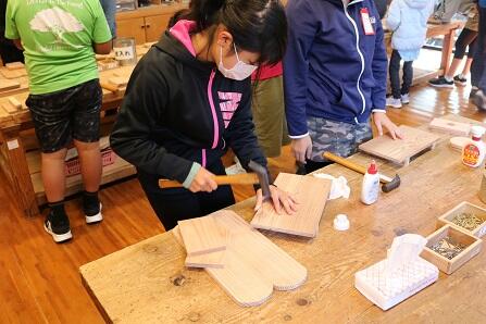 地域の方がくださった立派な木材のおかげで何やら楽しい作品ができそうです。安全に気を付けて、みんなで金づちをトントンしていました。