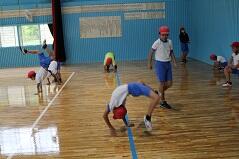 広い体育館を2カ所に分けて、2組がそれぞれの場所で、先生から指導を受けます。