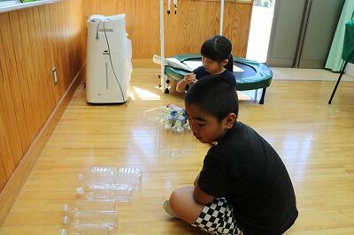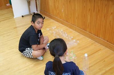 教室には、たくさんのペットボトルが並べられ、子どもたちは、熱心にそれらの材料を組み合わせています。