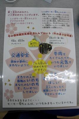 1年生へ入学のお祝いとして、牛の個体識別耳標と同デザインのネームプレートをを持ってきてくださいました。