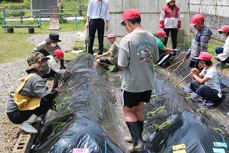 おまけ・・・外で4年生が理科でひょうたんを植えていました。
