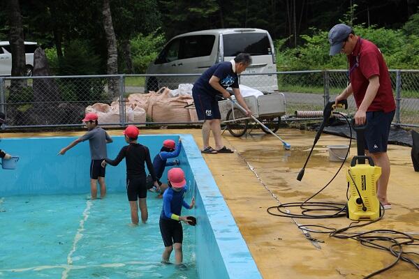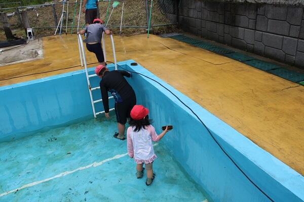 高圧洗浄機は私です。朝の7時からやり始め、気付いたらプール掃除が始まる9時過ぎまでやってました。プールサイドのヌルヌルは子どもたちにとって大変危険です。