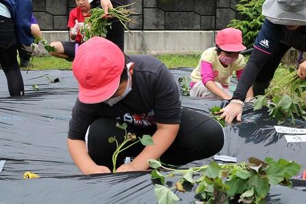 学校用務員の先生の話を聞いて、いざ芋植えです。