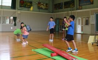 ※I先生もチャレンジ!この後見事にランドセルでキャッチしました。