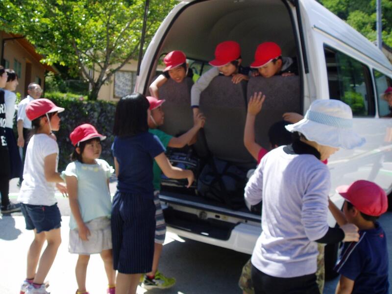 いよいよお別れの時です。バスに乗り込み出発する草小の