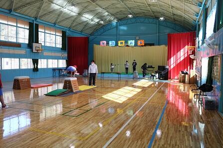 体育館をのぞくと、半分体育、半分音楽という、なかなかシュールな光景がありました。