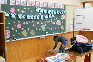 【教室の装飾は1・2年が担当】   【 白い布を丁寧にはります 】