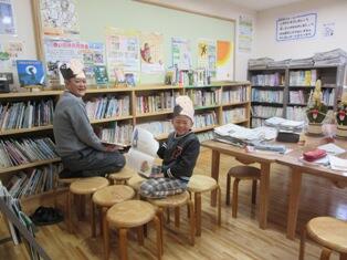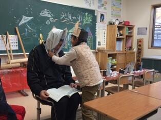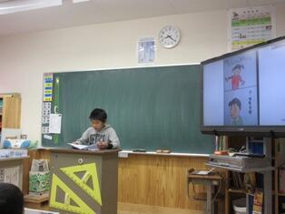 2年生は、教頭先生と「かさこじぞう」の学習をしています。