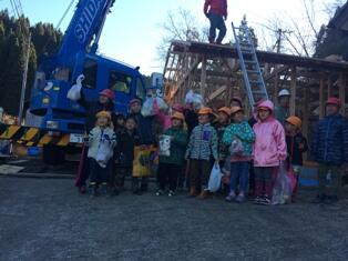 今日は、棟上げが行われました。たくさんのお菓子が落ちてきて、袋いっぱい拾いました。