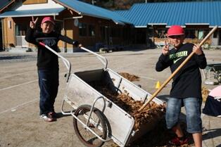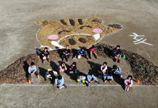 生がみんなで、黄色や茶色、黒の落ち葉を敷き詰めていきました。そ