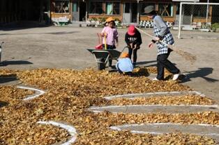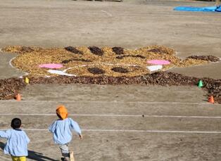 今日の5時間目に、小学生・保育所生みんなで「落ち葉アート」に挑