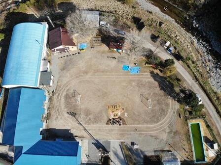 て、設計図をもとに運動場に絵を描きました。そこに、小学生・保育所