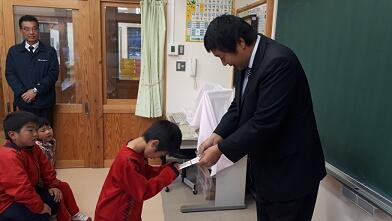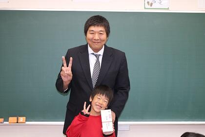 平家祭りの児童作品展において村長賞に輝いた1年生に、教育員会
