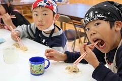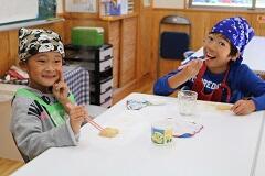 【 味噌汁に舌鼓の高学年 】 【今度は中学年が「がね」作り】