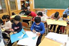 子ども達は好きな色の画用紙に絵を描いたり、英語でメッセージ