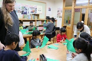 【 1・2年生がALTをエスコート 】   【 みんな一生懸命作ってます 】