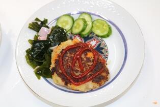 はん・サツマイモとたまねぎとにんじんの味噌汁、ポテトとツナのハンバ