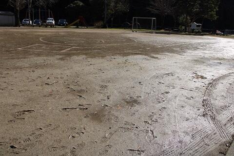 この写真の人工芝の手前部分です。この写真ではわかりにくいですが、もっと手前は砂利が敷いてあり、その砂利が運動場に入ってしまします。そこで、大工事です。