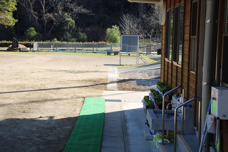 昨日、玄関前から校舎に沿って人工芝の張り替えを行いました。校長先生、保健室の先生、用務員さんに人工芝をつないでいただきました。なかなかきれいな出来映えです(^^)