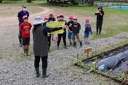 学校用務員の先生の話を聞いて、いざ芋植えです。