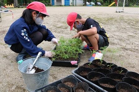 残った時間は、芽から育った花の苗を、大きめのポットに移す作業をしました。