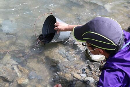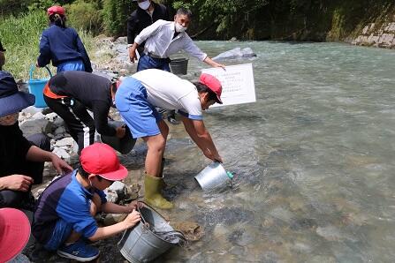 椎葉村漁業組合が行っている事業ですが、本校児童がそのお手伝いをしました。