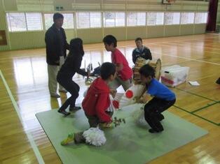 懇談の時間を使って子どもたちは、地域の方々から神楽を教えていただきました。