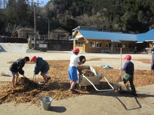 どんどん姿が消えていくくまもん。しかたなく、掃除の時間に片付けをして、くまもんとさようなら。子どもたちは一輪車で何往復も葉っぱを運び、撤去作業。