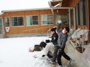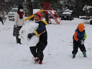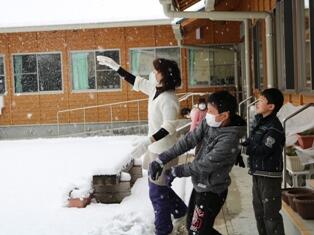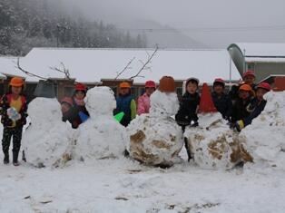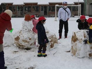 業間の時間に保育所生と一緒に雪だるまを作りました。子ど