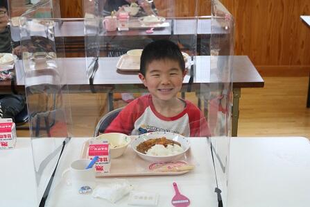 昨日入学して、今日は小学校初めての授業・初めての給食でした。複式学級なので、2年生と一緒の授業です。給食は、ポークカレーとスパゲッティーサラダ、お祝いクレープでした。おいしそうに食べていますね。