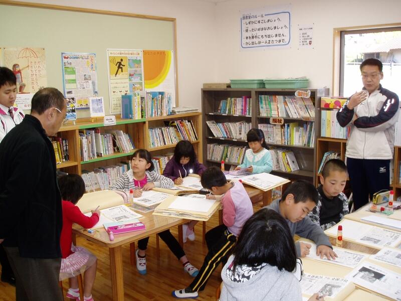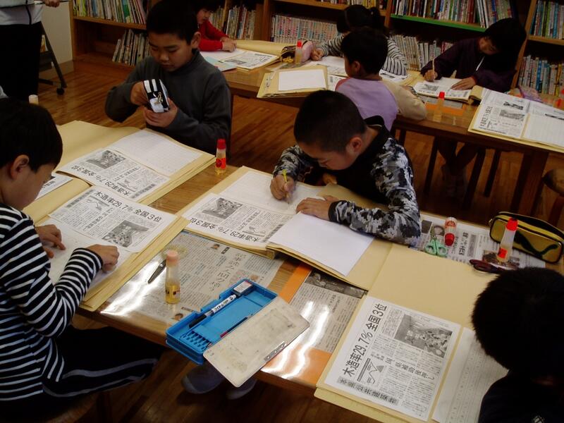 る学習でした。1~6年生までが新聞をはるスクラップブックを持って図書室に集合し、