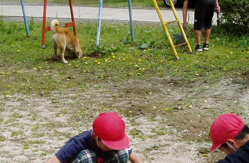 っていました。すると近所の犬がやって来て、子ども達のそばで草抜き?(穴掘
