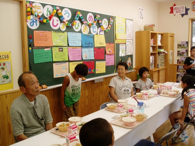 【 ひえつき節の先生と一緒に誕生給食 】   【 カイリ先生と外国語活動 】