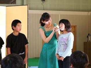 演奏するための呼吸の仕方を代表児童が体験したり、全員で音楽に