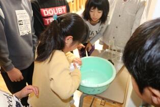 り出す水の量を競い合わせ、メスシリンダーで正確に量っ